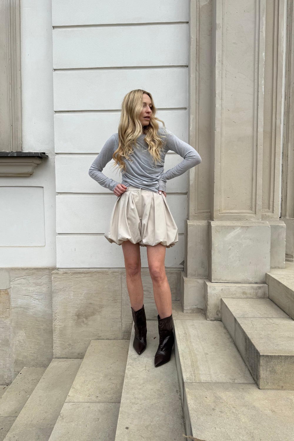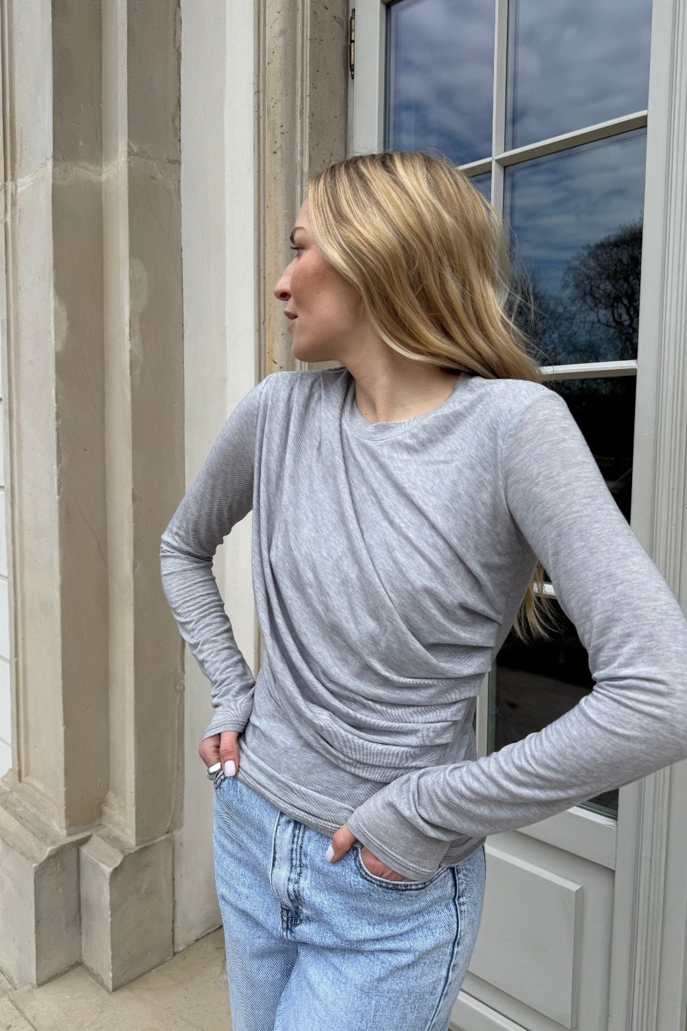 Okrągły dekolt, dopasowany krój i długi rękaw do nadgarstka tworzą minimalistyczną bazę — idealną solo i pod marynarkę.