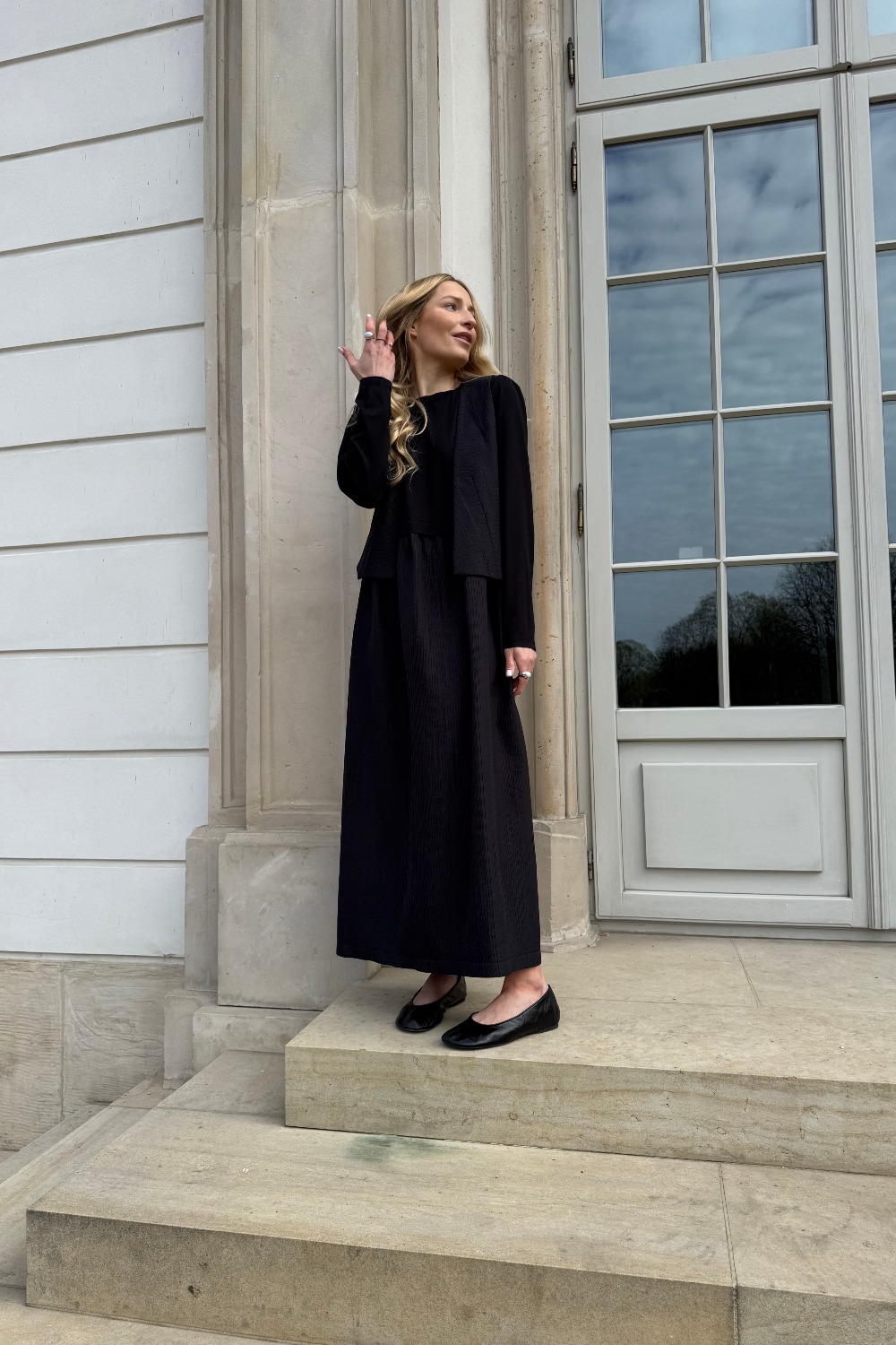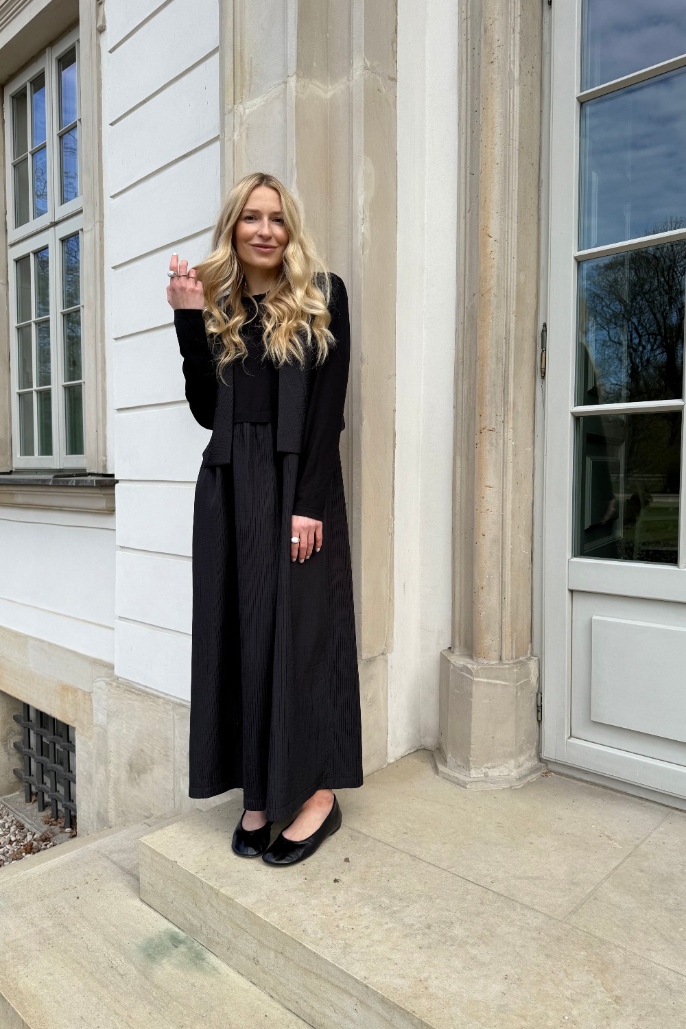 Sukienka o swobodnym fasonie, łącząca dwie efektowne faktury — gładką, miękką dzianinę na górze i lekko połyskującą, plisowaną tkaninę na dole. Czarny kolor i minimalistyczny krój nadają jej elegancji w codziennym wydaniu.
